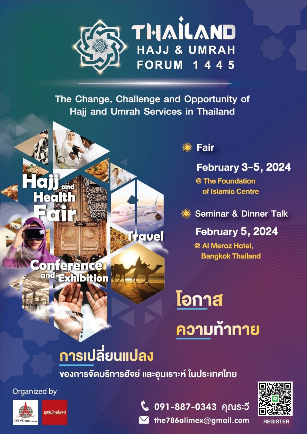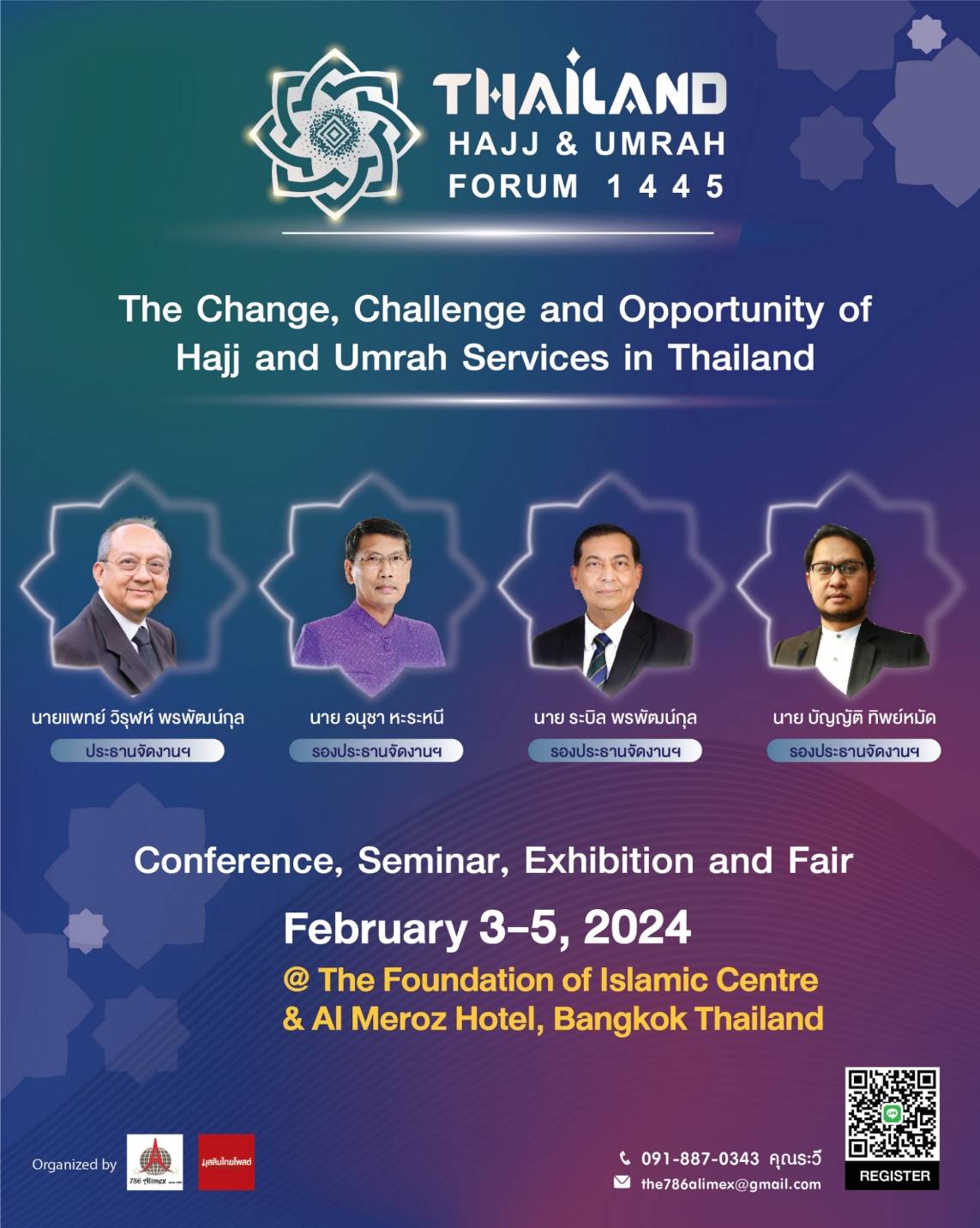 ภายใต้แนวคิดหลัก (Theme) คือ Change, Challenge & Opportunity ใช้ชื่องานว่า “ฮัจย์และอุมเราะห์ฟอรั่มประเทศไทย 1445 - Thailand Hajj and Umrah Forum 1445” จัดที่ โรงแรมอัลมีรอซ และมูลนิธิเพื่อศูนย์กลางอิสลามแห่งประเทศไทย ถนนรามคำแหง ในระหว่างวันที่ 3-5 กุมภาพันธ์ 2567